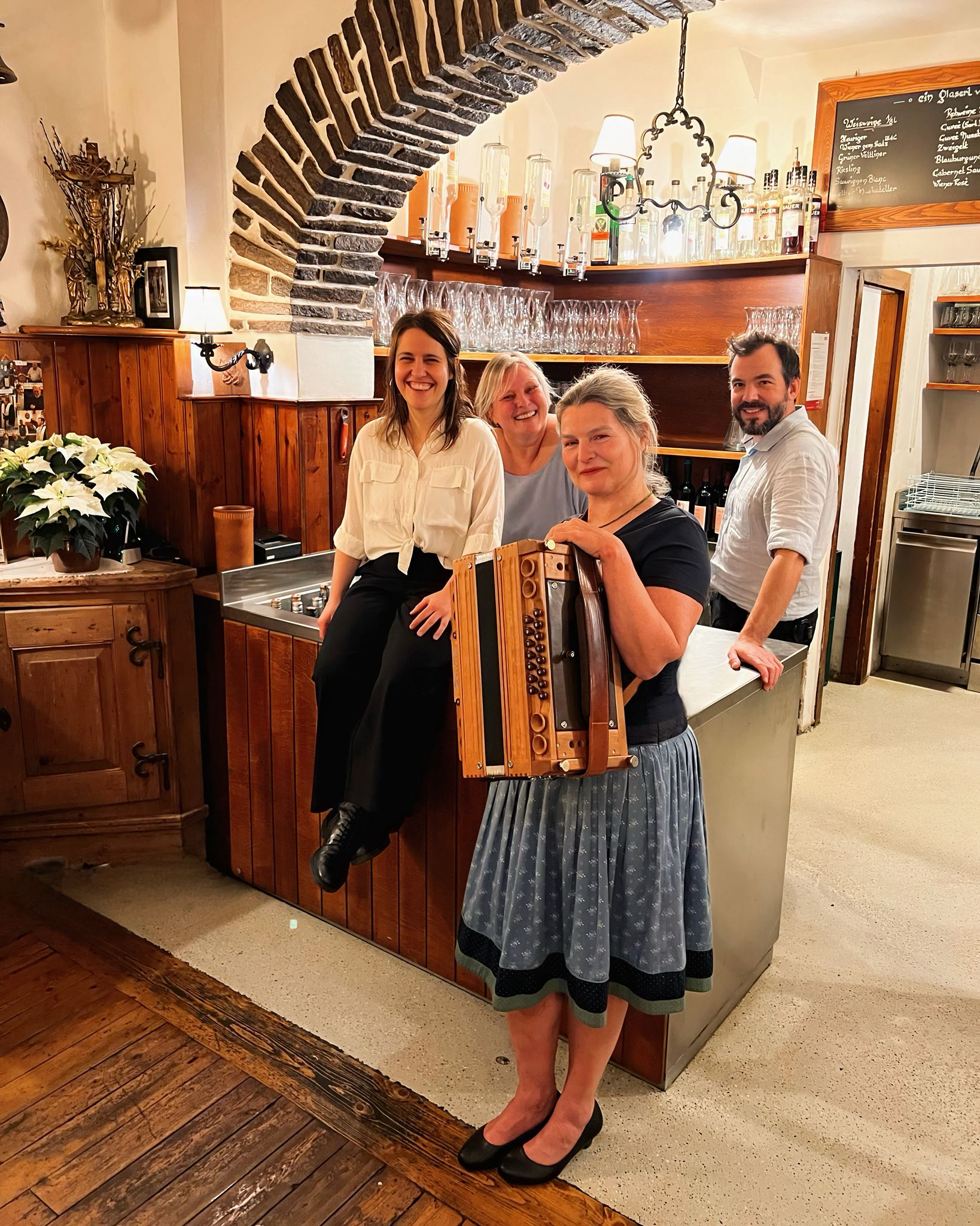„Schankpartie ist urösterreichisch und doch ist die Chefin eine „Zuagroaste“ aus dem Allgäu, die aber in Wien nicht nur die große Musik inhaliert hat, sondern auch jene Musik, die oft ganz unscheinbar hinter dem Tresen hervordringt und dennoch viel von der Seele ihrer Interpretinnen preisgibt. Gemeinsam mit Else Schmidt, Magdalena Prötsch und Willibald Rosner spielt Nicola Benz alpenländische Volksmusik und Musik aus Wien, die sich im Konzert fein mischen. Zum Tanz singen ist mindestens genauso traditionell wie das Aufspielen, nur bereichert der Text die Musik um durchaus pikante Details, wer mit wem das Tanzbein schwingt und was sonst noch allerhand auf, abseits und unter dem Tanzboden passiert.“